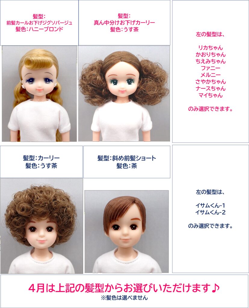 2026年2月〜4月の3か月、毎月3種〜4種の髪型×キャラクターを組み合わせて自分だけのオリジナルドールを作成する事が出来ます。