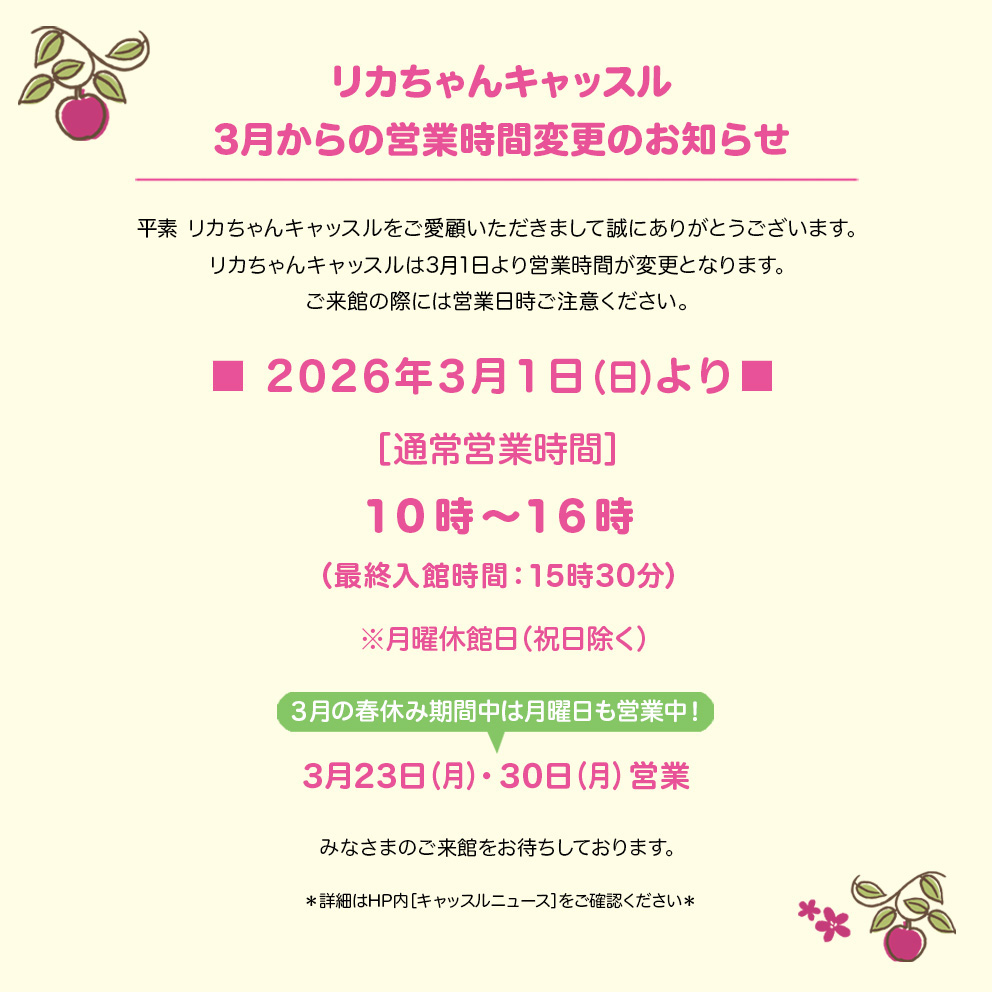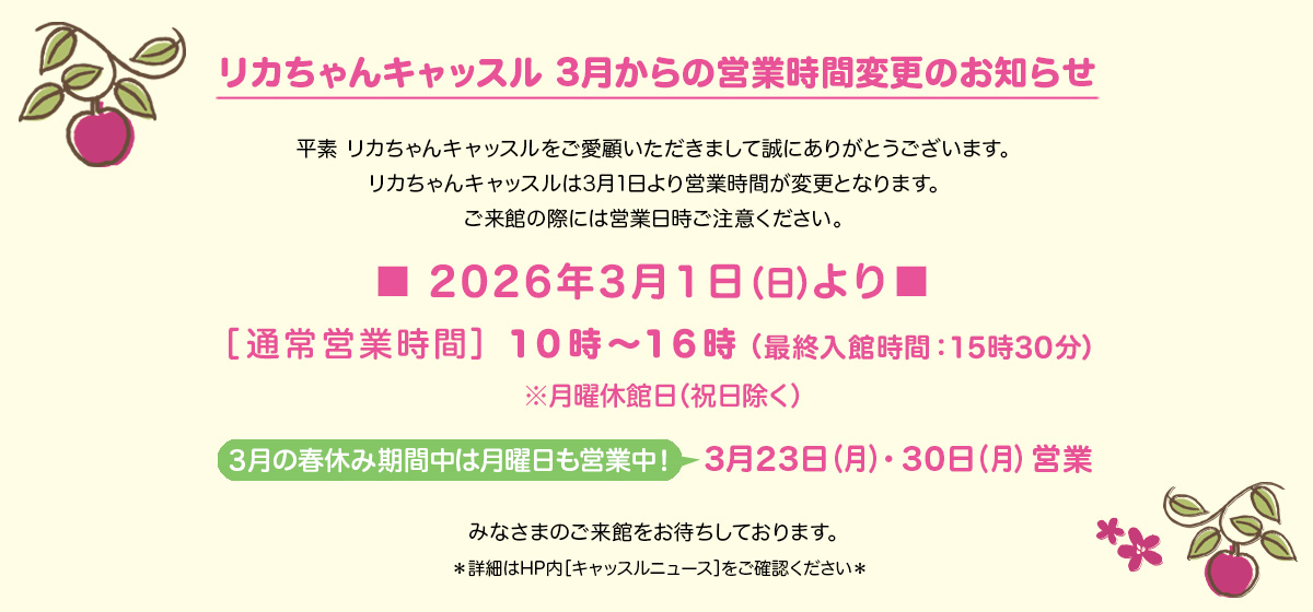 - 【リカちゃんキャッスル】 営業時間変更のお知らせ